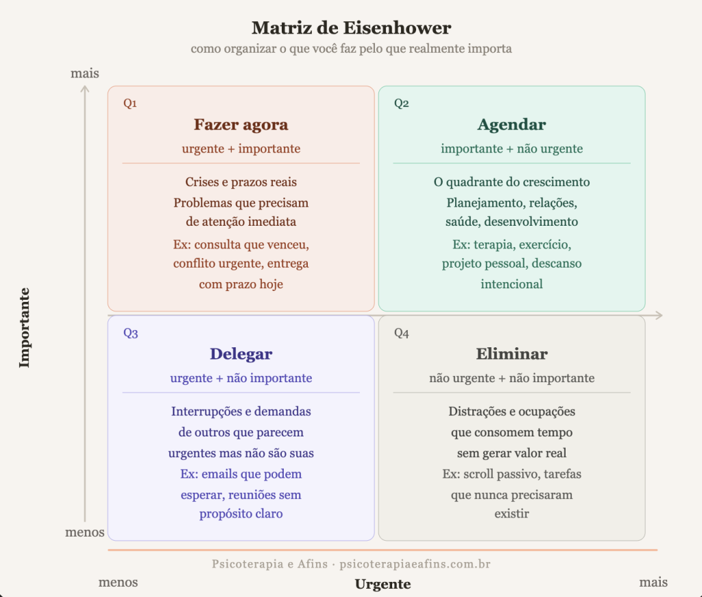 A Matriz de Eisenhower, popularizada por Stephen Covey em “Os 7 Hábitos das Pessoas Altamente Eficazes” e baseada numa frase atribuída ao ex-presidente americano Eisenhower, divide as tarefas em quatro quadrantes: urgente e importante, importante mas não urgente, urgente mas não importante, nem um nem outro.